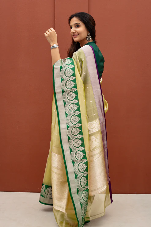 Products Details Banaras tissue brocade silk handwoven with contrast gold zari designs all over Ganga Jamuna borders Contrast the Banaras Silk blouse with coordinated borders. The saree comes with its own blouse piece. The one worn by the model is only for styling purposes. Wash Care Hand Wash Only: We recommend hand washing our sarees…