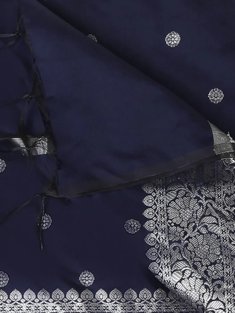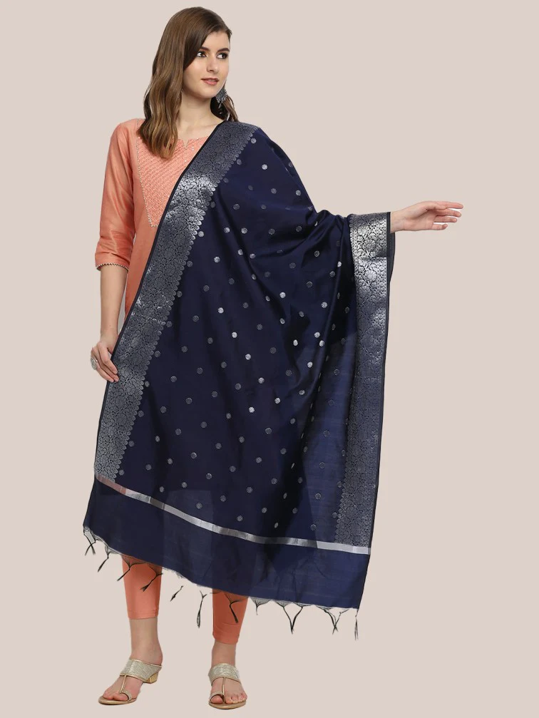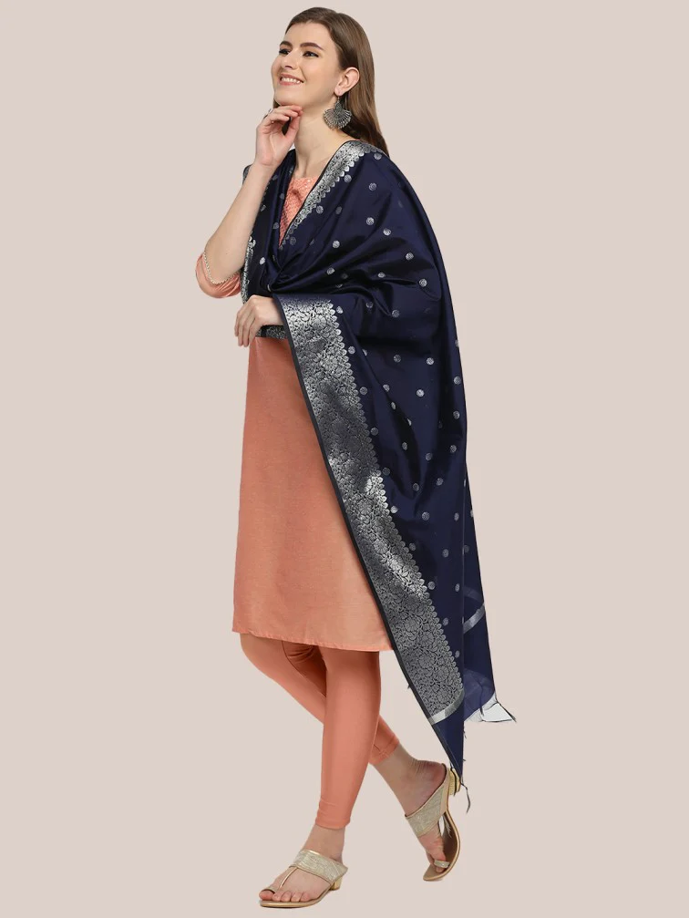 - This Fine Banarasi dupatta is adorned with beautiful woven motifs along with rich silver zari border.