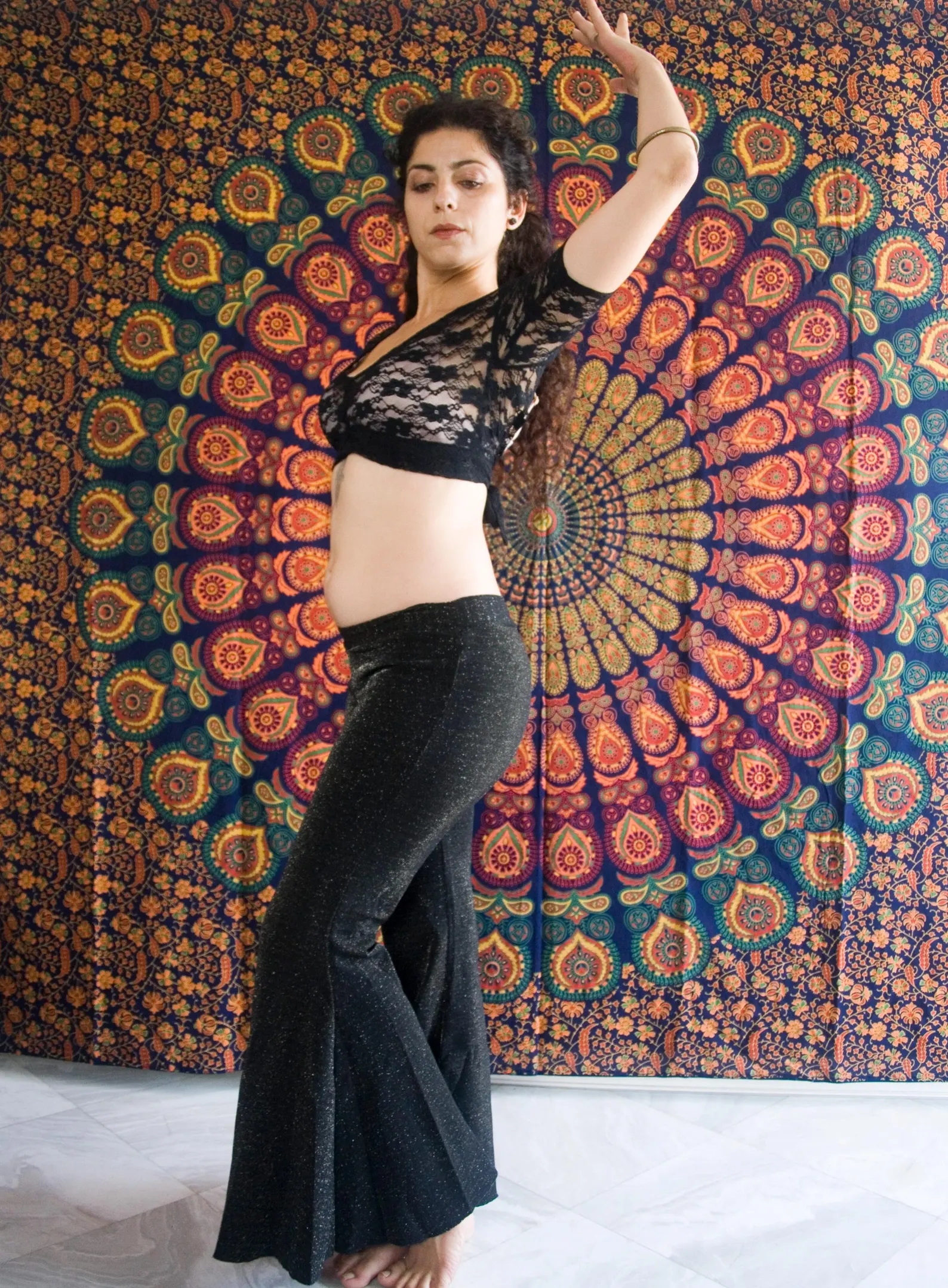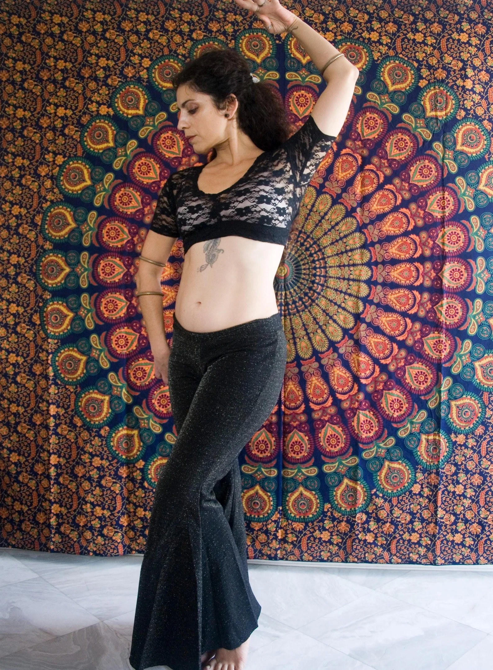 Black lace crop top with open back.