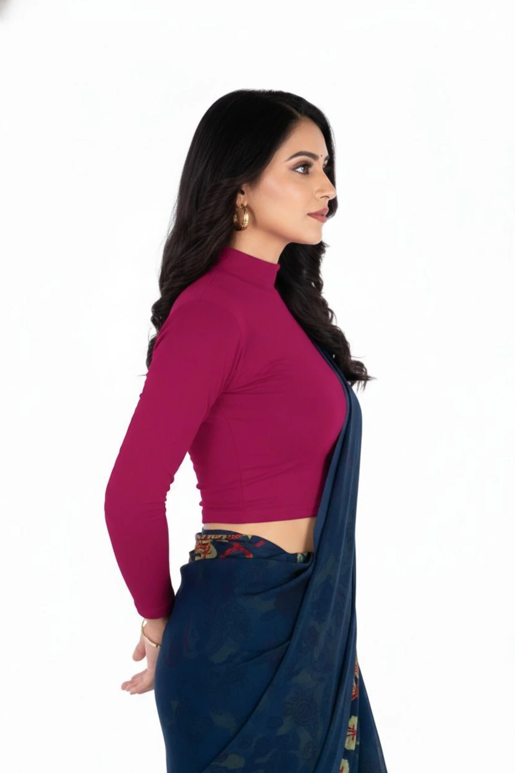Elevate your ethnic style with this elegant high-neck cropped blouse, designed to pair perfectly with sarees, lehengas, and skirts. Crafted from soft, stretchable fabric, this blouse offersa snug yet comfortable fit that enhances your silhouette. The full sleeves and modern high neckline add a contemporary touch while maintaining a classy ethnic appeal. Ideal for festive occasions, parties, office wear, and casual ethnicstyling, this versatile blouse is a must-have wardrobe essential. The smooth finish and rich, solid color make it easyto mix and match with printed or plain sarees. Note: Sareeshown in images is for styling purposes only and is not included.