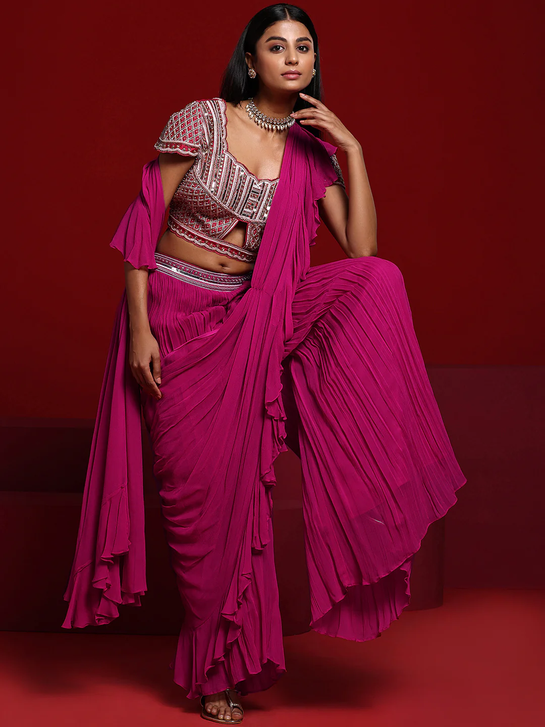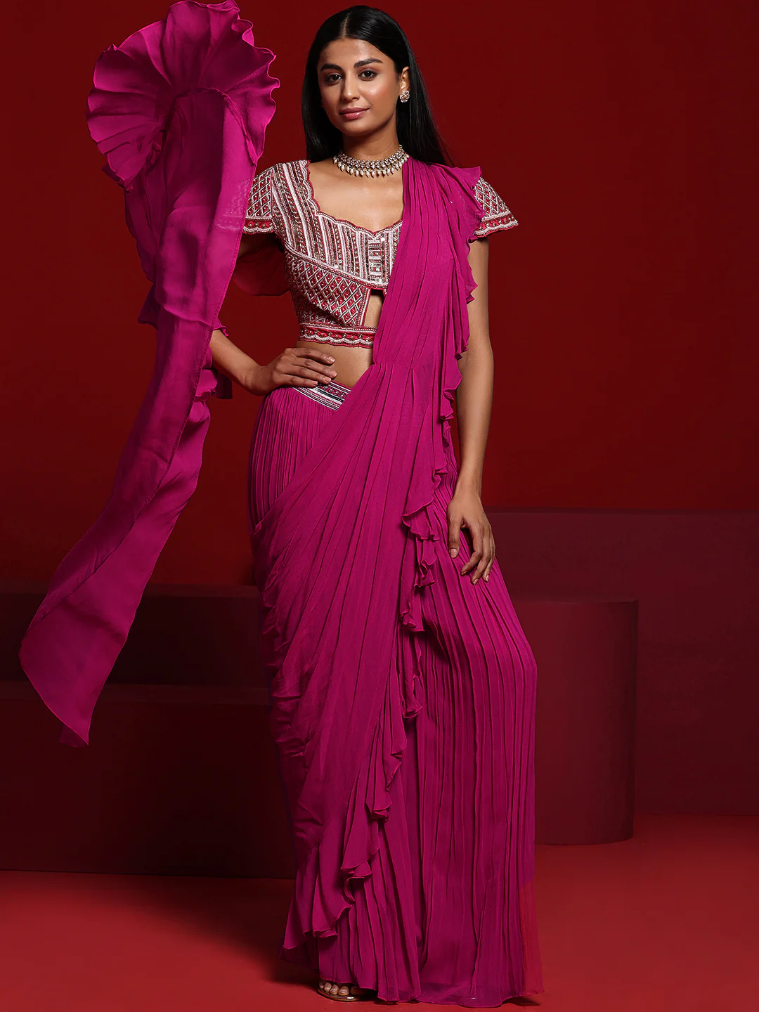 Our pink ruffled saree is crafted in sumptuous silk-blend fabric and features a short-sleeved blouse with a sweetheart neckline. Adorned with beaded accents and sequins, this style is perfect for festive celebrations.