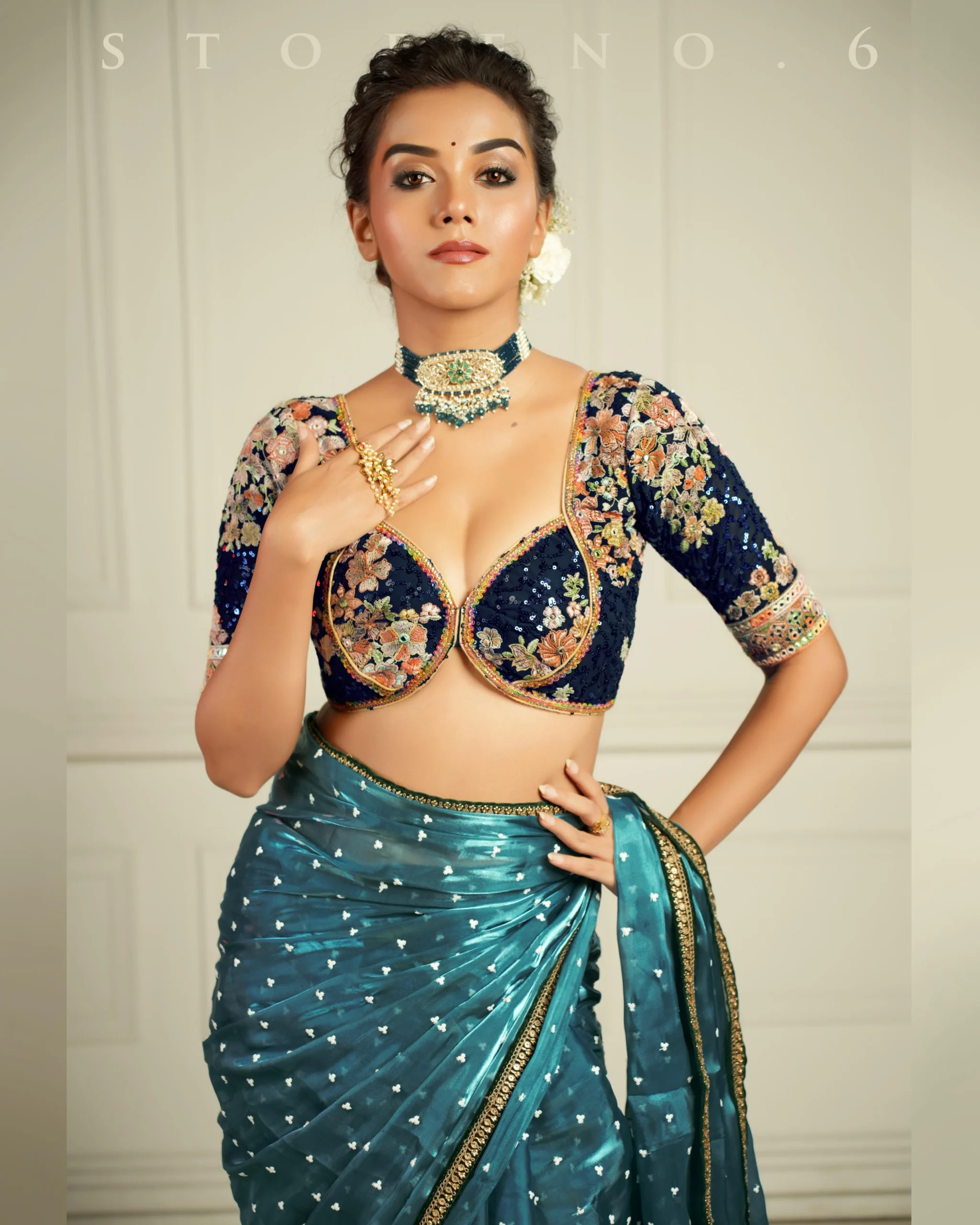 Description: Blue Georgette Elbow Sleeves Blouse with Multicolour Thread And Sequins Embroidery Works Fabric Details:Georgette with Thread and Sequins Works Colour:Blue Product Code:B23-BL4 Content: Blouse Care: Dry Clean Steam Iron Availability:Made to OrderOthers:Extra Customisation Available (Chargeable).
