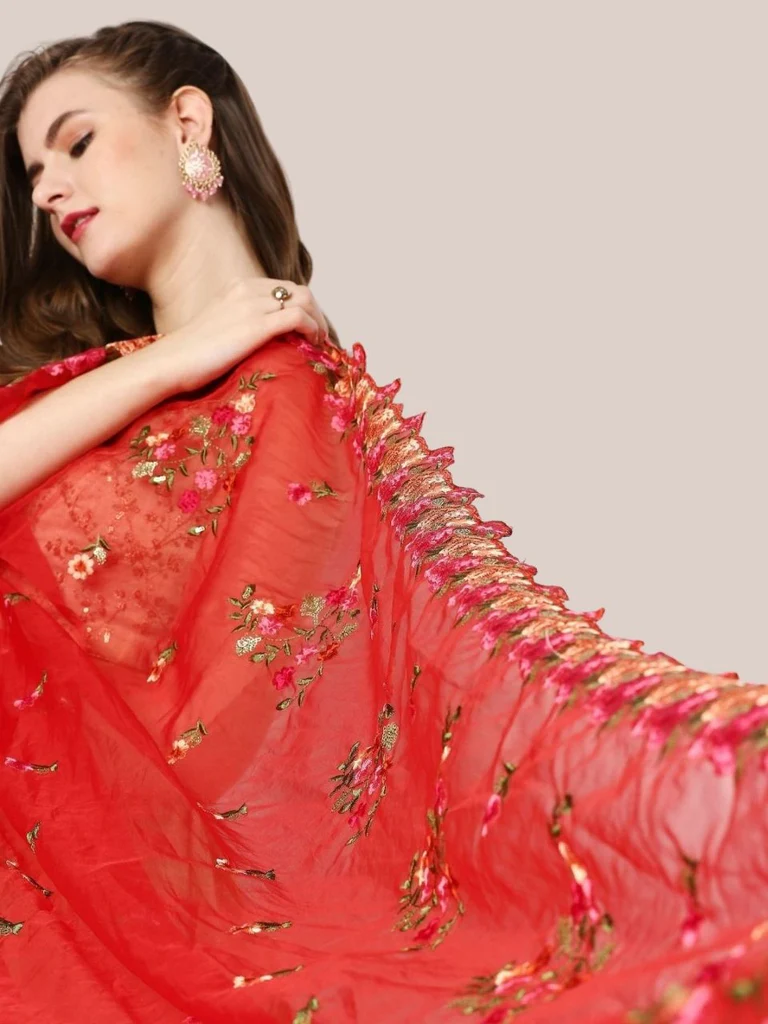 - This light weight organza dupatta is adorned with colourful embroidery all over along with scalloped borders .