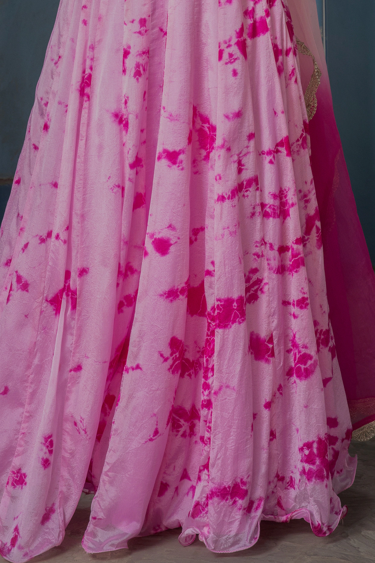 PRODUCT DESCRIPTION Featuring a pink blouse in viscose chinnon and a blended fabric base with an attached dupatta. It is paired with a matching lehenga having hand-tied dye, lace, and gota embroidery.