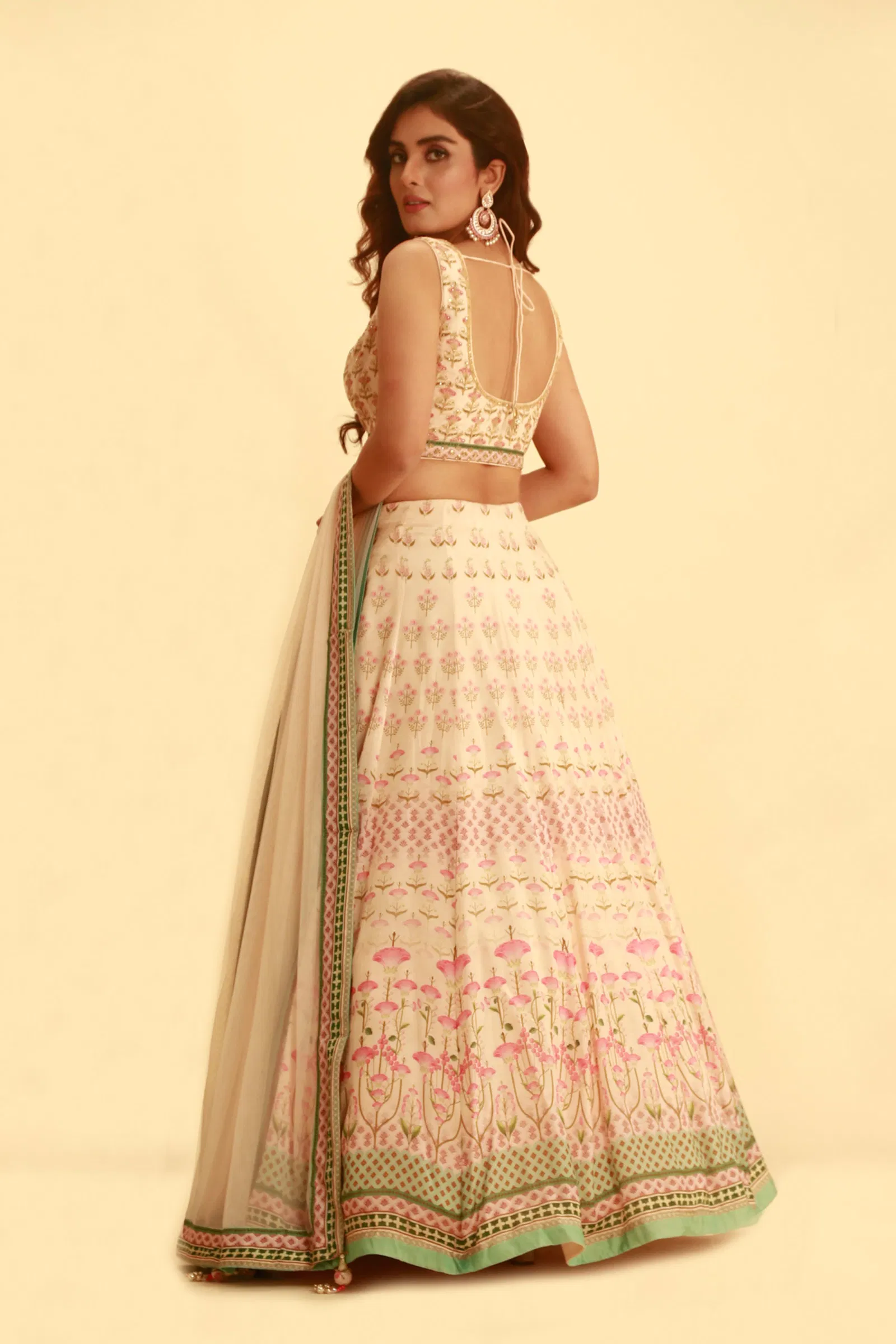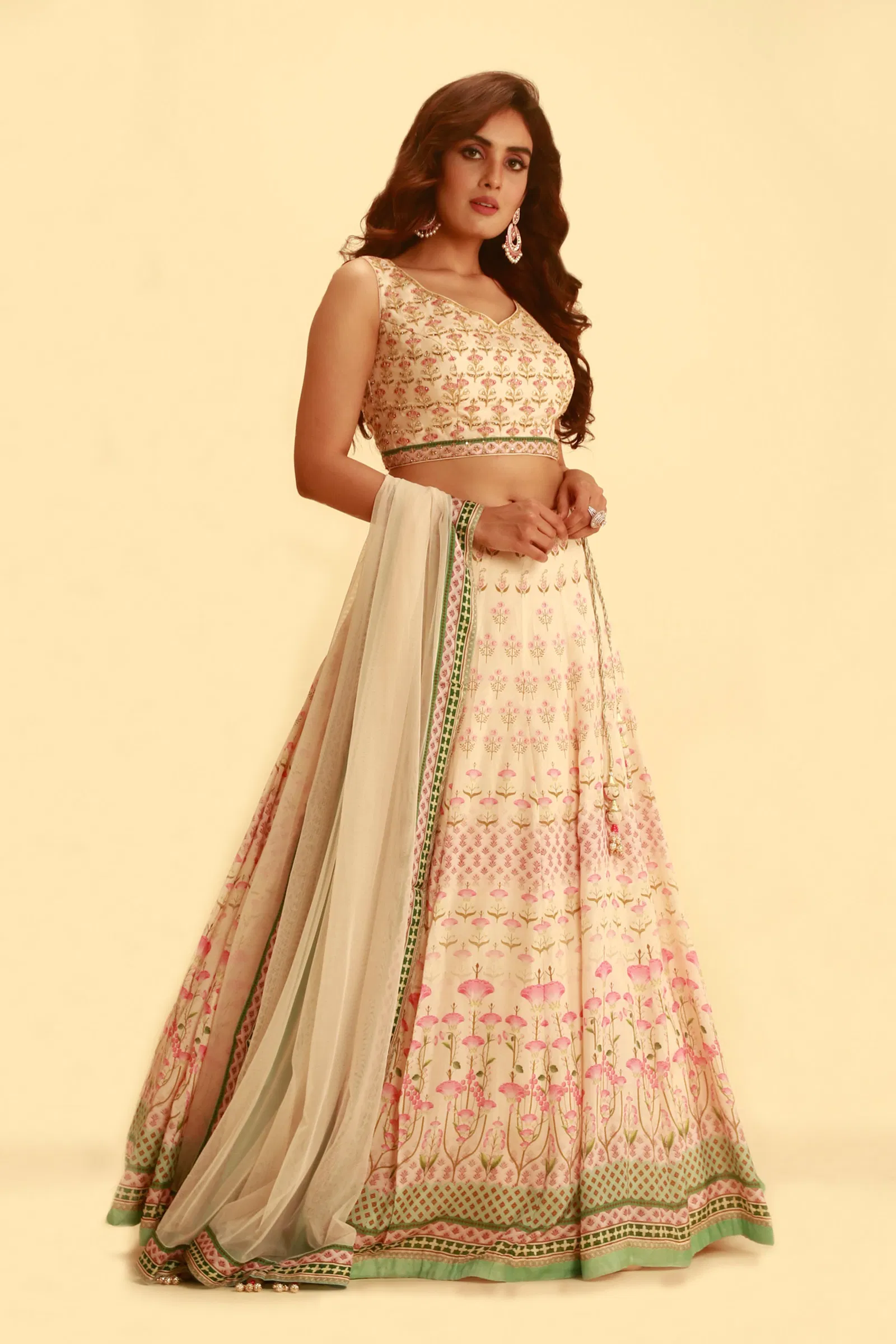 pink printed lehenga set with contrast fern green colour and matching tulle dupatta