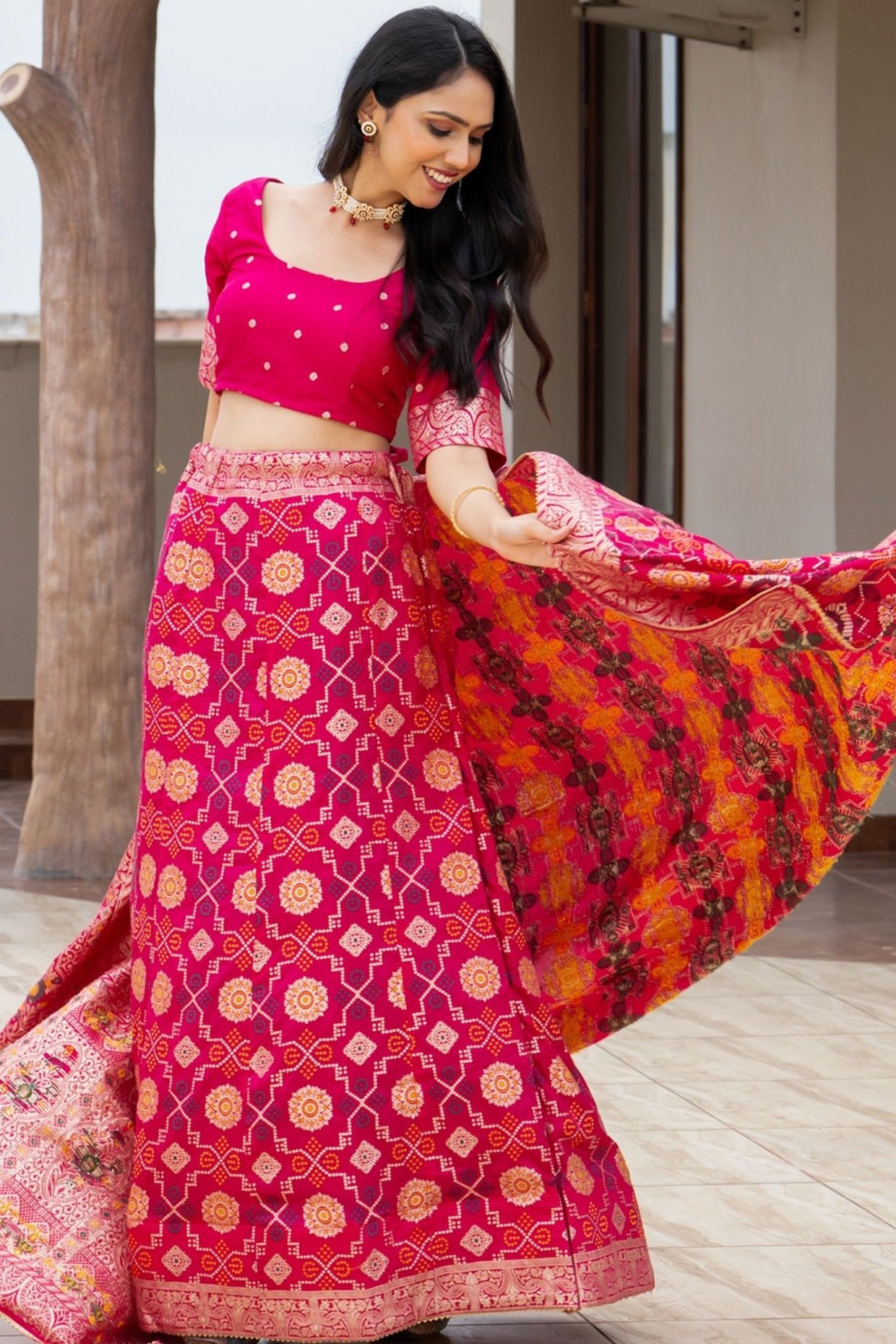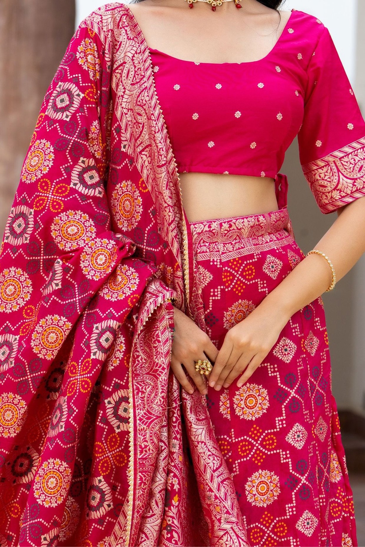 PRODUCT DESCRIPTION Featuring a Rani Pink lehenga in silk blend base. It is paired with a blouse and a dupatta. Accentuate it with diamond jewellery and block heels for sangeet, engagement ceremonies or weddings