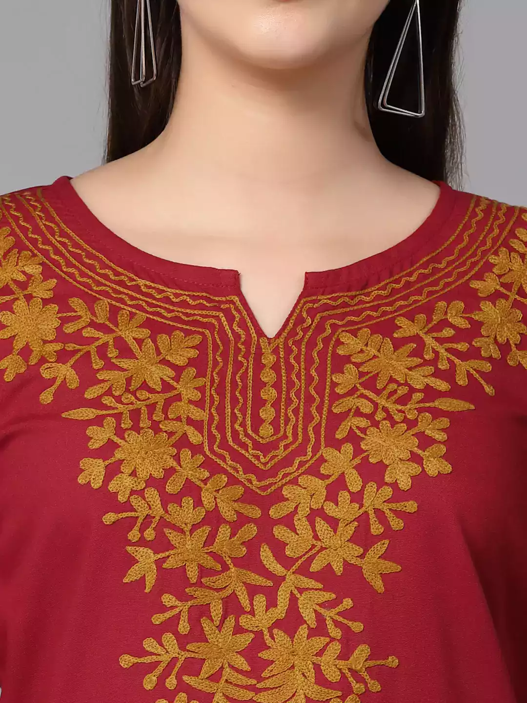 Colour: Red Kurti-type: Short Length: 26 Inches Sleeves: Three-Quarter Sleeves Neck: Keyhole Neck Shape: Straight Embroidery: Kashmiri Embroidery- 100% Authentic Fabric: Rayon Cotton Wash care: Machine Wash