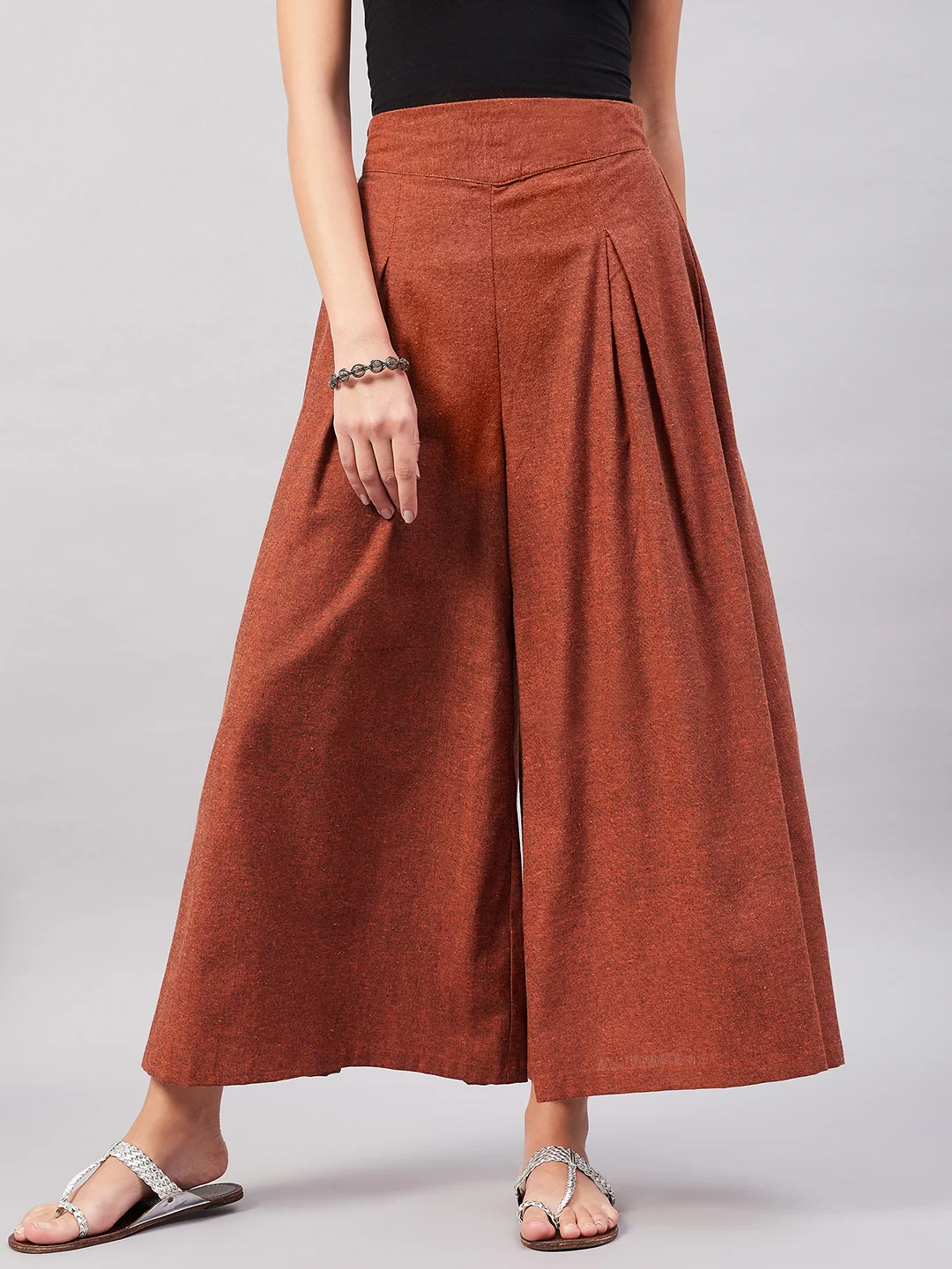 Embrace the spirit of summer with this pair of cool, gray-colored handloom palazzos. These cropped palazzos are made with original cotton fabric and showcase pretty front pleats.