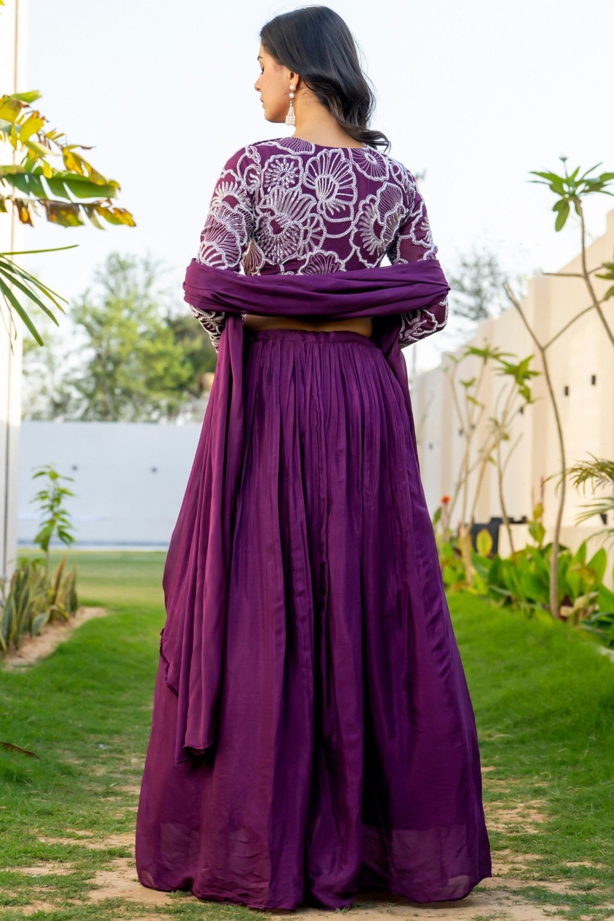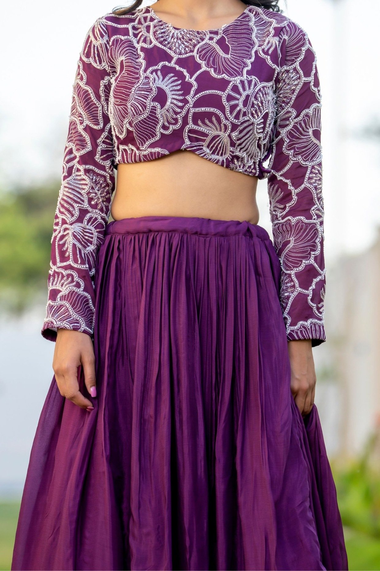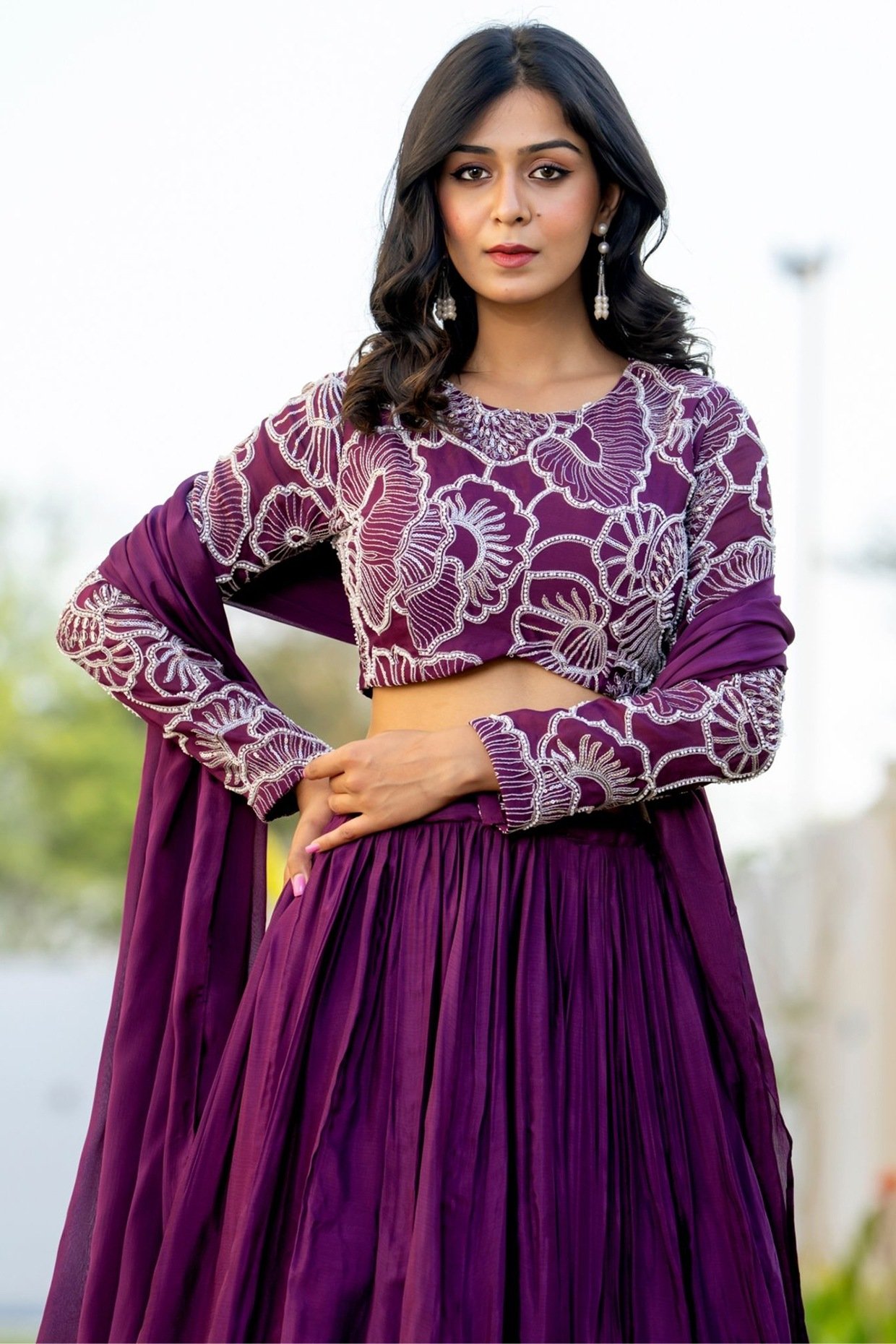 PRODUCT DESCRIPTION Featuring a wine lehenga in chinon and organza base. It is paired with a crop top having floral embroidery and a dupatta. Accentuate it with dangler earrings and heels for festive occasions or wedding ceremonies. Components 3 (Lehenga, Crop top, Dupatta) FIT Fitted at bust and waist. COMPOSITION Chinon, Organza. CARE Dry clean…