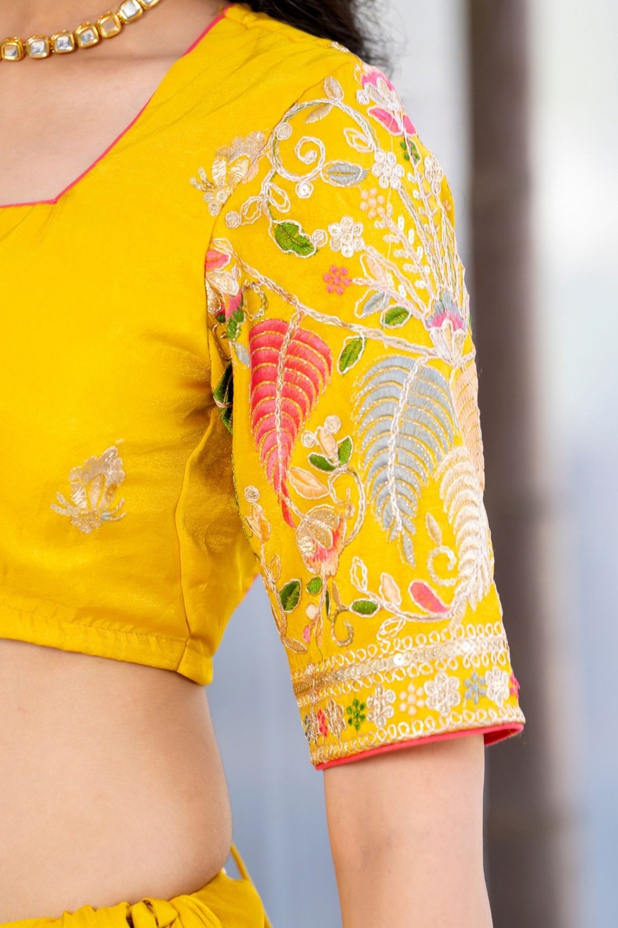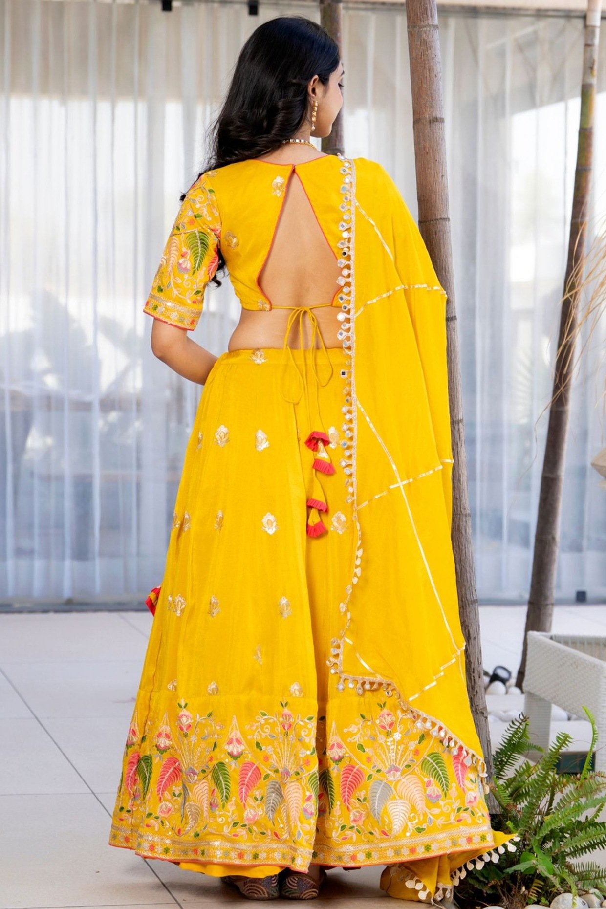 PRODUCT DESCRIPTION Featuring a yellow lehenga in tissue base with zari and floral embroidery, including tassels hanging. It is paired with a blouse and a dupatta. Accentuate it with dangler earrings and heels for festive occasions or wedding ceremonies. Components 3 (Lehenga, Blouse, Dupatta) FIT Fitted at bust and waist. COMPOSITION Tissue. CARE Dry clean…